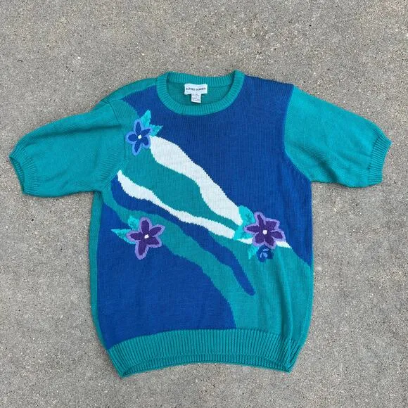 Vintage 90s Alfred Dunner abstract waves floral knit short sleeve sweater size small flat measure... Show more