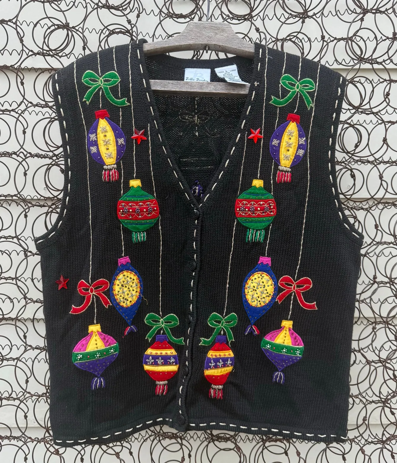 Vintage 90s Bobbie Brooks Christmas Ornaments Stars Sweater Vest Black Embroidered Applique design all over the front button front (some discoloration on some buttons) cotton ramie blend tag size LARGE good preowned condition measurements in photos