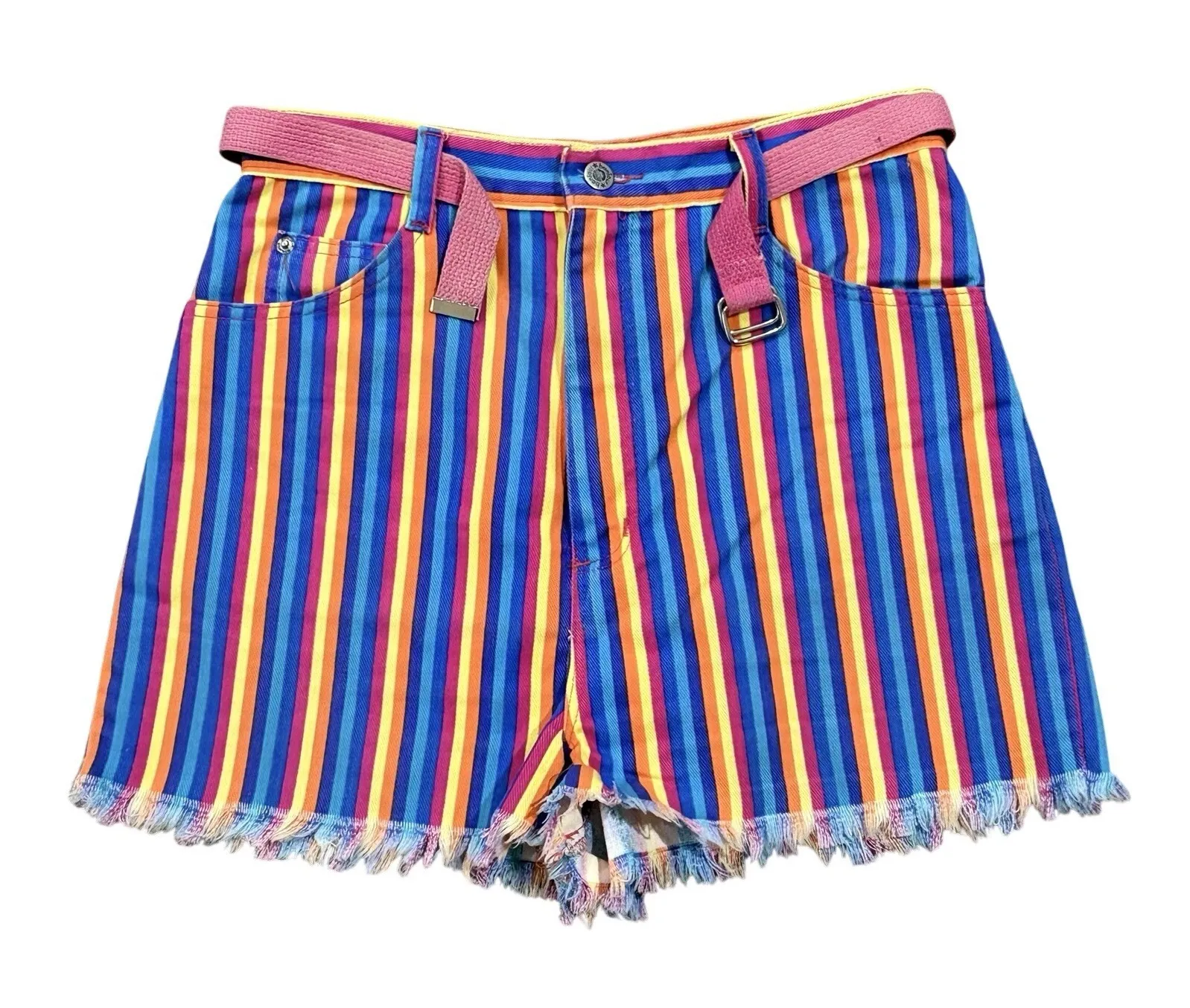 Add a vibrant pop of color to your summer wardrobe with these vintage 90's Bonjour rainbow stripe denim shorts. Crafted from sturdy cotton denim, these high-waisted shorts feature a bold multicolor vertical stripe pattern and a raw frayed hem. Made in the Dominican Republic in the 1980s or early 1990s, these shorts embody "Full House" style with a flattering silhouette and playful energy. Details: • Brand: Bonjour • Size: 11/12 • Material: 100% Cotton • Condition: Excellent Measurements (Approximate): • Waist: 29" (these shorts are extreme high waist so waist fits a lot higher than normal) • Hips: 38" Rise 14" • Length: 15.5" • Inseam: 2"
