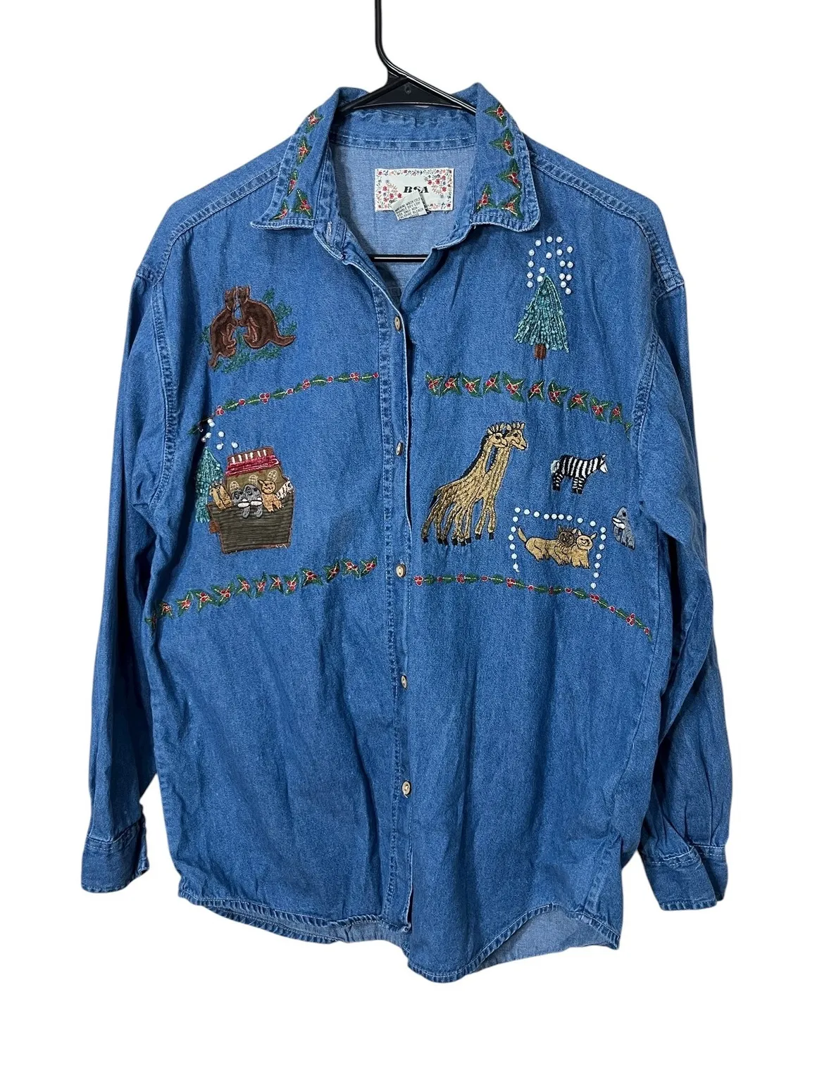 Unique vintage 1990s denim shirt featuring elaborate embroidery. This button-down shirt showcases a playful design with various animals including bears, a giraffe, a zebra, and lions, Noahs Ark themed. The light wash denim provides a classic backdrop for the detailed embroidery, which extends across the collar and front. Note the presence of a couple stains near the embroidered animal basket and arm sleeve, as shown in the pictures. Color: Blue Type: Button-Up Department: Women Material: 100% Cotton Neckline: Collared Sleeve Length: Long Sleeve Sleeve Type: Classic/Fitted Sleeve Accents: Embroidered, Button Pattern: Noah's Ark Keywords: vintage, 90s , denim, embroidered shirt, animal print, novelty, retro, religious, !!!Please See Measurements vintage sizes run smaller than modern sizes!!! Measurements Length: 29 inches Pit to Pit: 21 inches Arm Length: 21 1/2 in