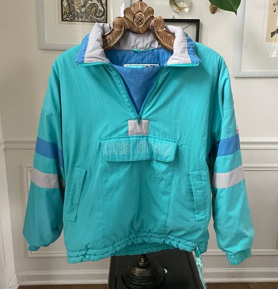 Vintage 90s C&A club fifteenpull over half zip puffer. This pullover is midweight and not some thing that I think is technically winter wear. it is puffy with soft brushed windbreaker outer (it doesn’t make that scratching noise windbreaker material sometimes makes). Half zip pull over styling that can zip up to cover your neck or unzipped to display the gray and blue collar with a panel of blue material to block the wind. And just above the flap pouch pocket in the center that says club 15 across the flap, and two welts hip pockets on each side. Blue and gray stripes on each sleeve with elastic at the cuff. Teal green base. Toggle cinch waist on the inside. Laying flat measures approximately 25 inches shoulder to hem and 23 inches armpit to armpit. There is no tag size other than a small tag that says 164 so I believe this might’ve been a European size but based on the measurements, I am listing it as a size XL. Please double check the measurements to ensure the proper fit for you.