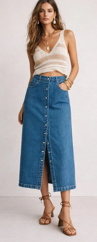 Vintage 90s Cherokee brand denim midi/maxi skirt. Snap front. Pale blue wash. Size 10