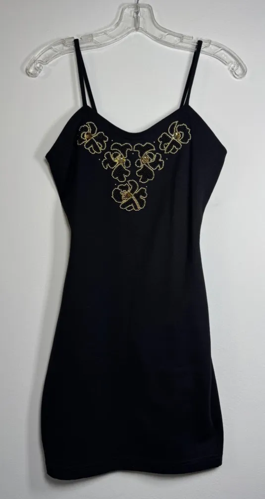 Measures 14 3/4 inches underarm to underarm, 25 inches underarm to bottom hem. The size tag is a S, and while the fabric does stretch, it’s a VERY tight, form-fitting dress and would probably best fit a modern U.S. Women’s XXS. In excellent pre-owned condition.