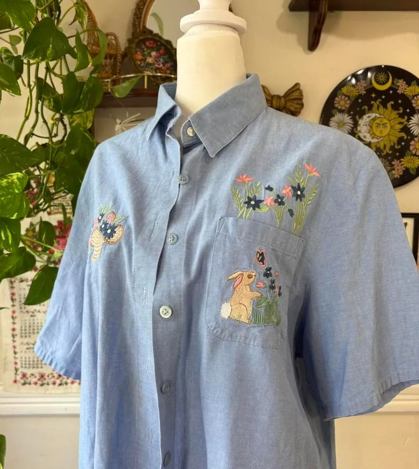 Vintage 90s Denim Blue Bunny Floral Embroidered Button Up Short Sleeve Grannycor Size L - $16 - From Kelly