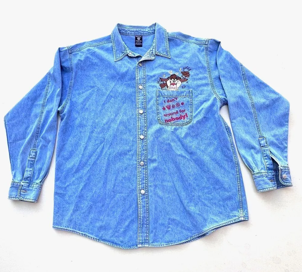 Size XL Color blue Pre-owned really good condition like new Please see photos for measurements (in inches). We suggest comparing them to something you currently own to ensure a perfect fit. Please feel free to message us with any questions not answered in the listing. Super Fast Shipping: We ship out same or the next business day! Combined shipping available. This vintage Warner Bros denim shirt is perfect for any occasion, whether you're travelling, going to work, or just hanging out casually. Featuring an embroidered Taz design, this button-up shirt has a collared neckline and long sleeves with buttoned cuffs. The heavyweight denim fabric, with its solid blue color, makes it ideal for winter, summer, fall, or spring. The shirt has a regular fit and is size XL, with pockets on the front. It's made of 100% cotton and belongs to the Warner Bros Studio Store product line. This shirt is perfect for anyone who loves the Lumberjack, Grunge, Work Shirt, Cowboy, Cartoon, Casual, Rockabilly, 90s, Taz, Tasmanian Devil, Preppy, or Trucker themes.