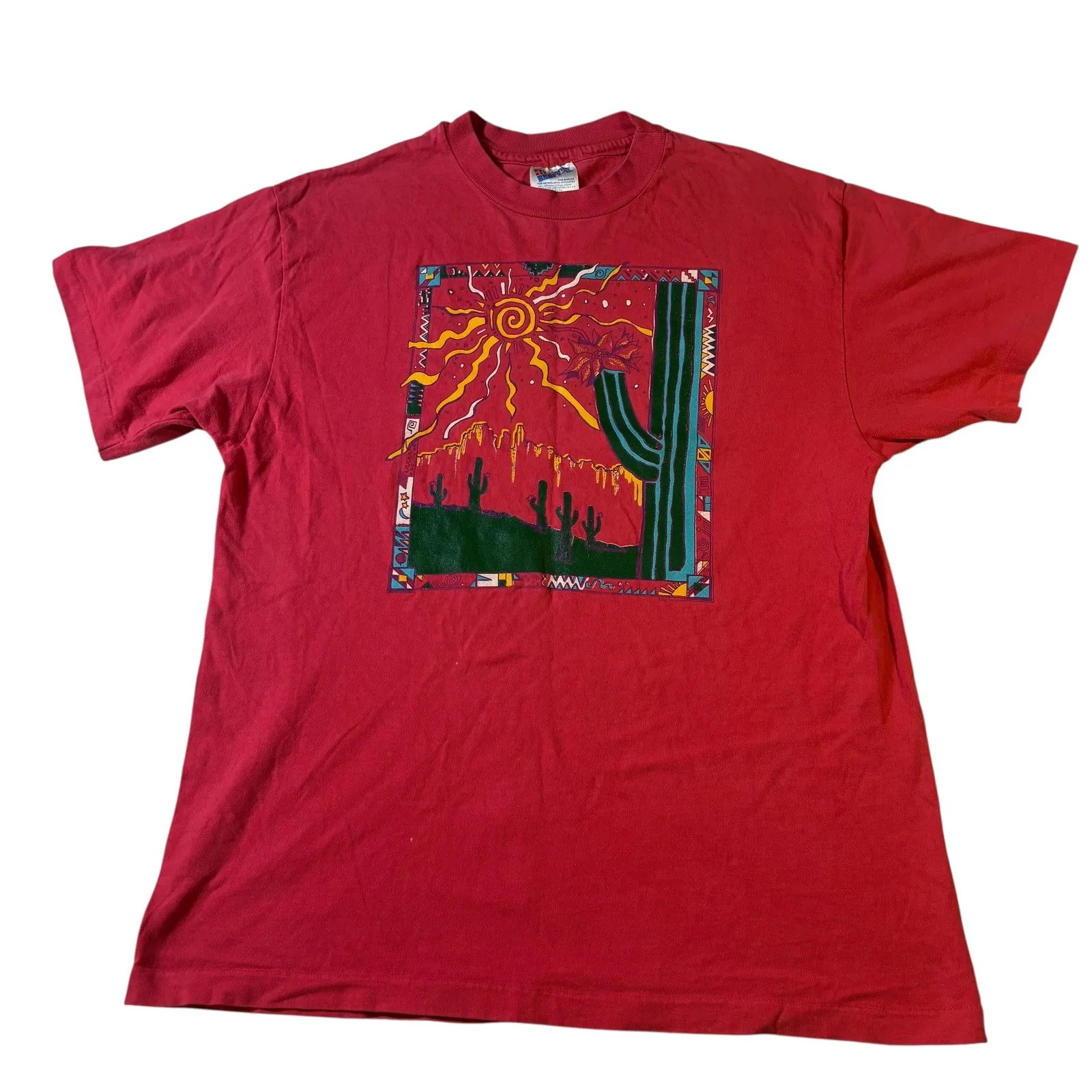 A vintage graphic tee featuring a vibrant desert scene encapsulated in a decorative square. This sho... Show more