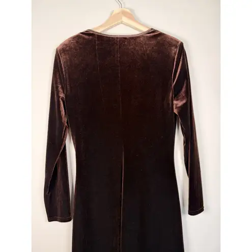This vintage 90s dress is a stunning piece with a brown velvet maxi length that is perfect for a goth or whimsigoth style. Made of polyester, this original dress in size 8 is ideal for a casual occasion or a holiday party, adding a touch of nostalgia to your wardrobe. The whimsical and dark aesthetic of the 1990s is beautifully captured in this dress, making it a unique and stylish choice for a nostalgic fashion lover.