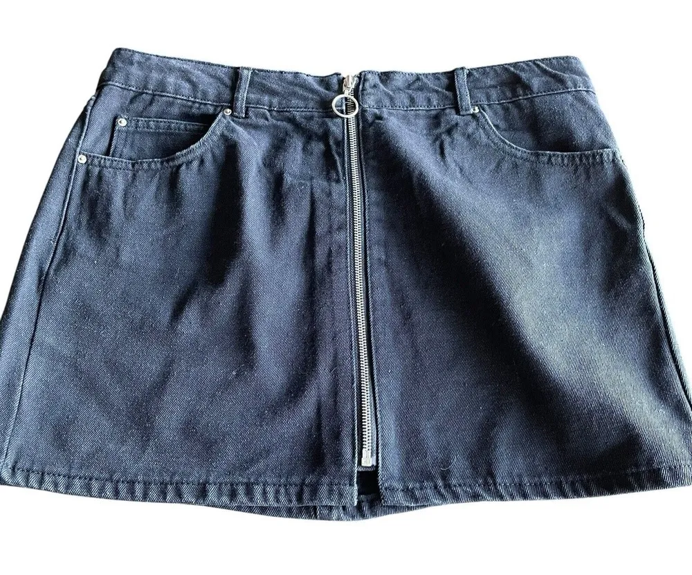 This vintage 90s Highway Jeans black mini skirt in women's size 11/12 features a retro zip-up design with a solid denim fabric and mid-rise waist. The skirt has a grunge, Gothic, and hipster style, perfect for casual wear, parties, or even workwear. With accents like buttons and zippers, this skirt offers stretch, breathability, and pockets for practicality. Made from a blend of polyester and cotton, it's machine washable and suitable for summer and spring occasions, adding a touch of motorcycle, city, and modern vibes to your outfit.