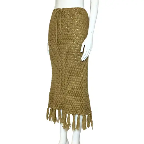 Warm camel colored openwork knit midi skirt with fringe and a drawstring waist from the 90s. Made in... Show more