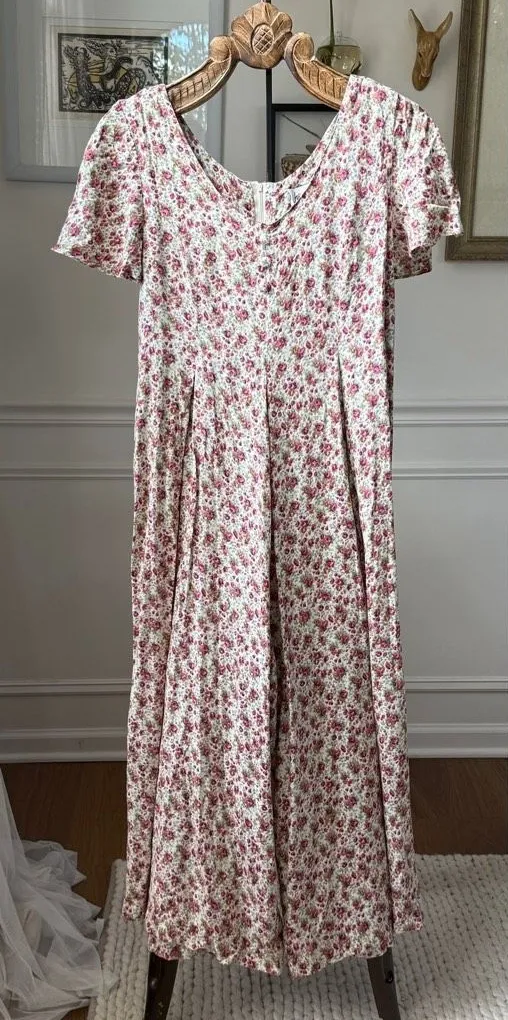 Vintage 90s Jeffrey & Dara scoopneck, short sleeve wide leg jumpsuit. Back zip closure and two back tabs that can tie for waste definition. Floral calico country cottage core print with pink roses, lavender flowers, and pink and tan roses with green leaves. Laying flat measures 18 inches armpit to armpit, 17 inches straight across the waist untied, 24 inches across the hip and 16 inches across the wide leg opening at the hem. The inseam is 22 inches but it is also drop waist and measures about an 18 inch rise so take that into account because it’s not quite as cropped as 22 inches would indicate. The tax petites on the brand tag and 12 on the size tag without indicating petite. Made in the USA 100% rayon.