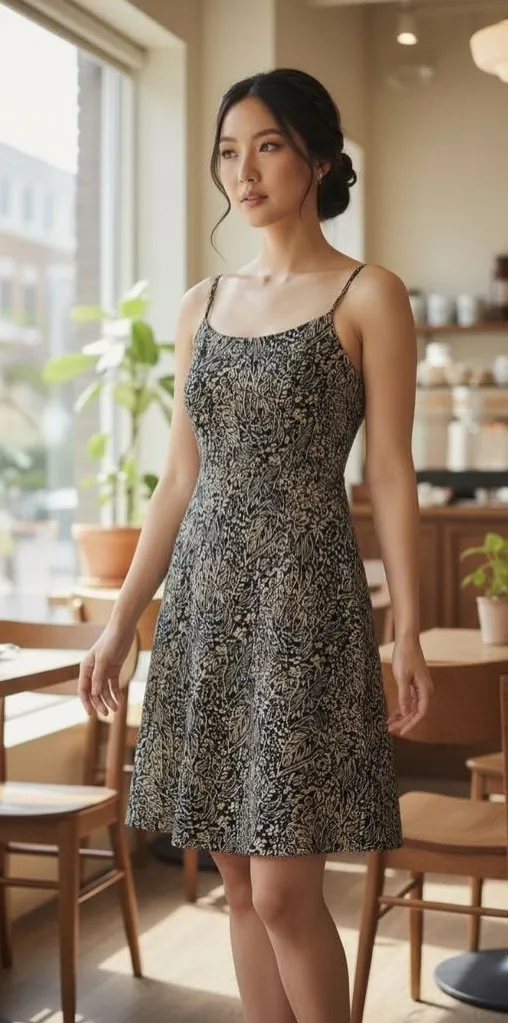 Vintage Jessica Howard fit-and-flare dress, made in the USA and tagged size 6. Features a classic scoop neckline with delicate spaghetti straps and a beautifully tailored bodice that flows into a gently flared skirt. The black and tan botanical floral print gives this piece a timeless, elegant look, perfect for work, events, or dressed-up daytime wear. Crafted in a non-stretch woven fabric with a structured, flattering silhouette typical of late 1980s–early 1990s design. Fully lined with quality construction. A great example of vintage American-made career chic. Excellent condition