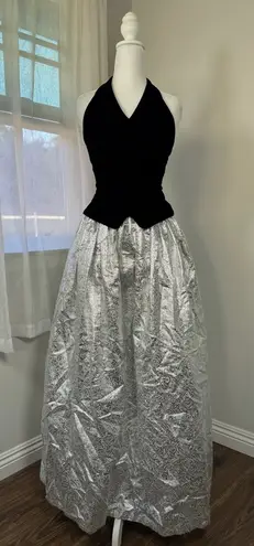 This gorgeous Jessica McClintock for Gunne Sax floor length formal gown features a black velvet halter neck bodice, a very full silver skirt, and back zipper closure. Measures 14 3/4 inches underarm to underarm, 48 inches underarm to bottom hem. The size tag is a 3/4; please note the dress is VERY small (I couldn’t get the zipper fully zipped on my XS mannequin); it would best fit a modern U.S. Women’s XXS Petite. Besides some very minor discoloring on the bottom hem liner (not visible when worn), the gown is in excellent pre-owned condition.