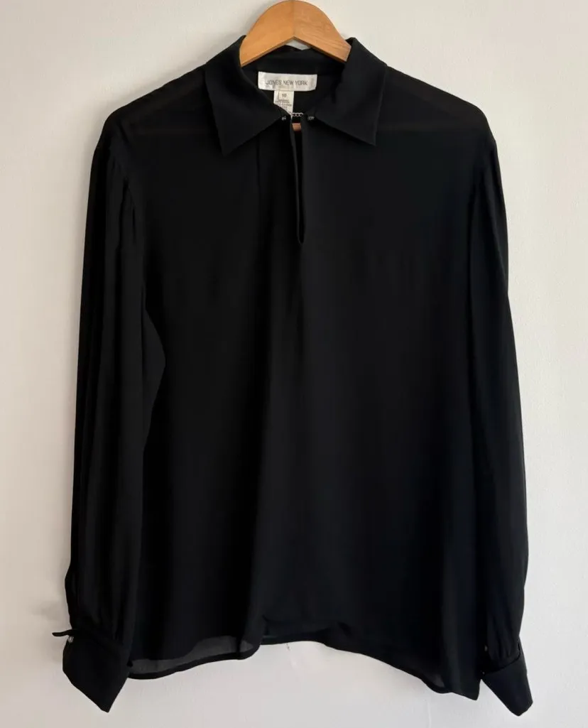Vintage 90s Jones New York whimsigoth black sheet long sleeve collared top Size 10 21.5” pit to pit... Show more