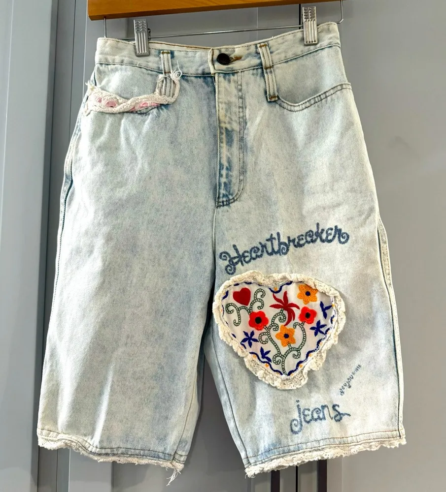 Adorable vintage high waisted jean shorts with heartbreaker theme. They are definitely well-worn. There is discoloration/light colored staining down the back of the left thigh. See last three photos. All other signs of wear should be obvious in photos. So. Stinking. Cute!! Vintage size 9/10, but closer to a modern small. See measurements. Flat Measurements: Waist 13 Rise 12 Inseam 10 Hem Width 8