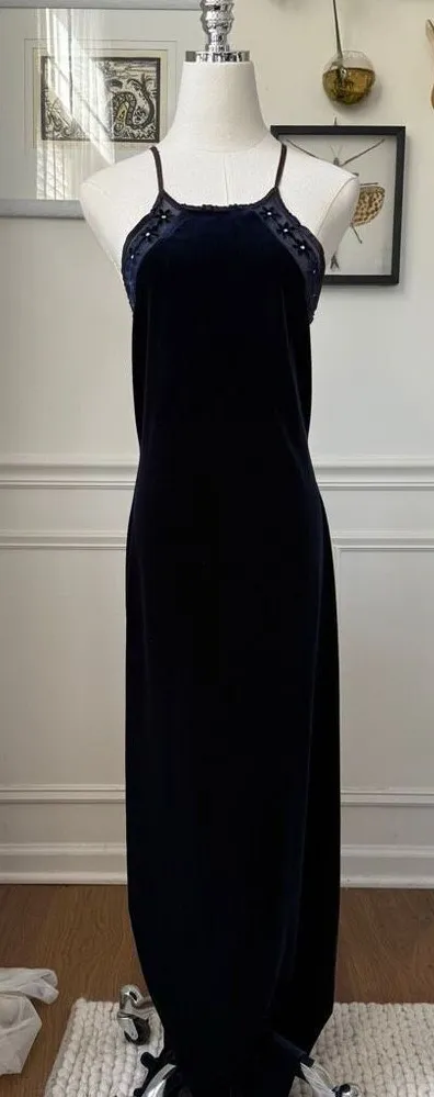 Vintage 90s Jump! Brand sapphire blue stretchy velvet column dress with sheer mesh back and Shima trim at the neck featuring cut out flowers, resembling daisies that are punctuated with a single rhinestone at the center. Some of the elastic is a little puckery, but it’s not really serving an elastic kind of purpose, it’s more just trim. See photos. Back vent for easy movement. Jump! was one of “the” brands for prom, etc. during this era. Tag size 3/4. Flat measures 16 inches armpit to armpit, 14 inches straight across the waist and 17 inches across the hip. 58 inches shoulder to hem. This is a stretchy polyester velvet and it has 10% spandex. It is featured on my size small dress form for scale. Please doublecheck measurements to ensure the proper fit for you.