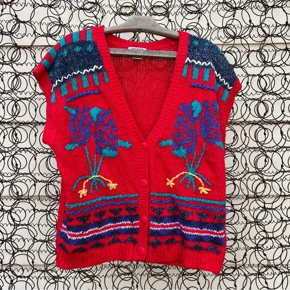 Vintage 90s Koret Red Floral Bouquet Embroidered Sweater Vest Cotton ramie blend Size medium petite... Show more