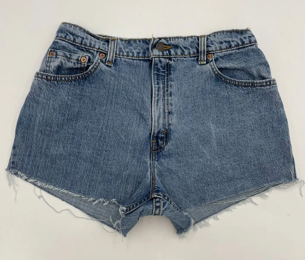 Vintage ‘95 Levi's cut-off 551 jean shorts with frayed raw hem, zipper fly, and 5 pocket styling. 10... Show more