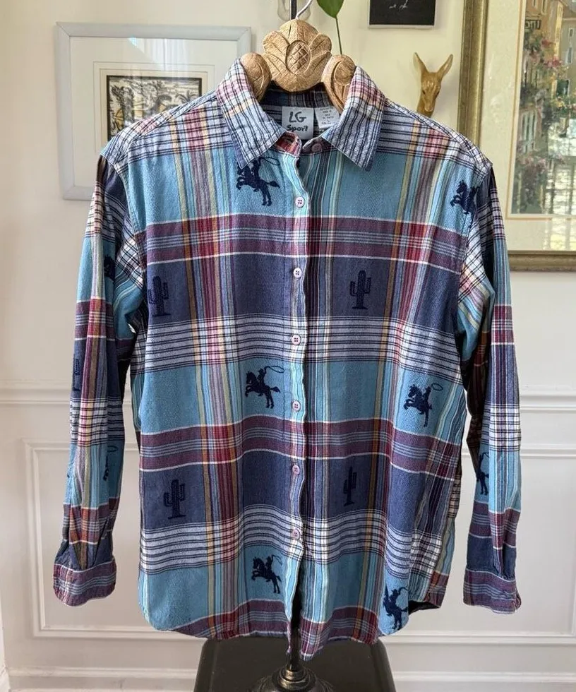 90s LG Sport 100% cotton plaid button up shirt for women featuring shades of blue, red, yellow, and white plaid and dark blue jacquard silhouettes of a lassoing cowboy and cactus giving us a casual southwestern vibe. Fun fact: LG sport was a division of LG appliances and electronics that you’re familiar with today. Who knew they used to have a fashion line? The shirt is made in India. Laying flat measures 27 inches shoulder to him and 22.5 inches armpit to armpit. LG sport was popular for their hip-hop fashions and streetwear in the 90s.