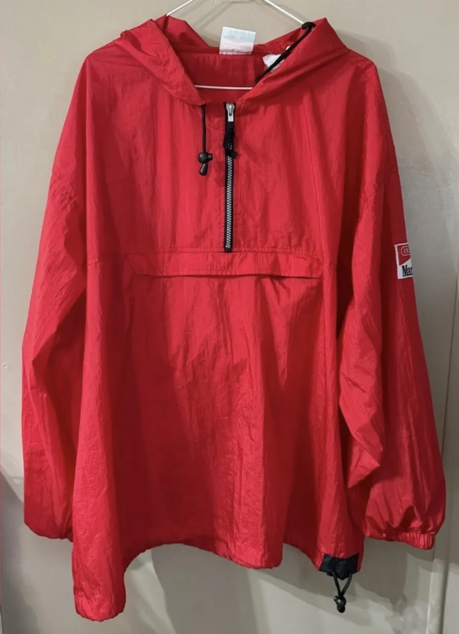 XXL - unisex Windbreaker jacket folds into a bag with a strap. The straps are in the zipper front pocket when jacket is in use. Easy to carry around Jacket in overall good condition. The only stain is when it’s in bag form, and it’s at the top by the zipper (pictured). This stain would be inside the pocket when in jacket form. It has been in storage, so it has trace of old storage smell.