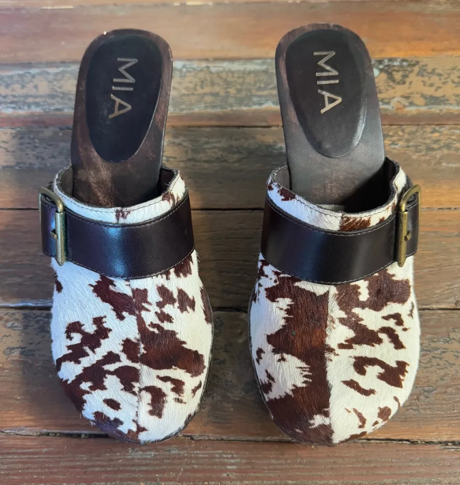 Iconic 90s western-inspired style. These vintage MIA cow print mules feature genuine calf hair uppers with a rich brown-and-cream hide pattern, wide leather strap with brass buckle detail, and a sculpted wooden platform heel. A true retro Y2K meets rustic western piece - perfect for styling with denim, slip dresses, festival looks, and modern boho outfits. Slip-on design with a comfortable molded footbed. Great vintage condition with light wear typical of age (see photos). Features • Authentic vintage 90s MIA • Genuine calf hair upper • Cow print hide pattern • Leather strap with brass buckle • Solid wood platform + heel • Slip-on mule style • Western-meets-boho look • Size: 7 Measurements • Heel height: approx. 3-3.5 in • Platform: approx. 1 in Great preowned vintage condition with general light wear to the wood and hair-on-hide consistent with age. western boho, retro 90s, Y2K revival, festival style, cottage western, rustic chic, cowgirl core, statement shoes, vintage mule, boho cow print, retro platform, hide leather mule, MIA cow print mules, calf hair shoes, vintage MIA shoes, western mule heels, wood platform mules, 90s cowhide shoes, leather strap mule, boho western shoes, retro 90s shoes, Y2K cow print, festival footwear, size 7 cow print mule