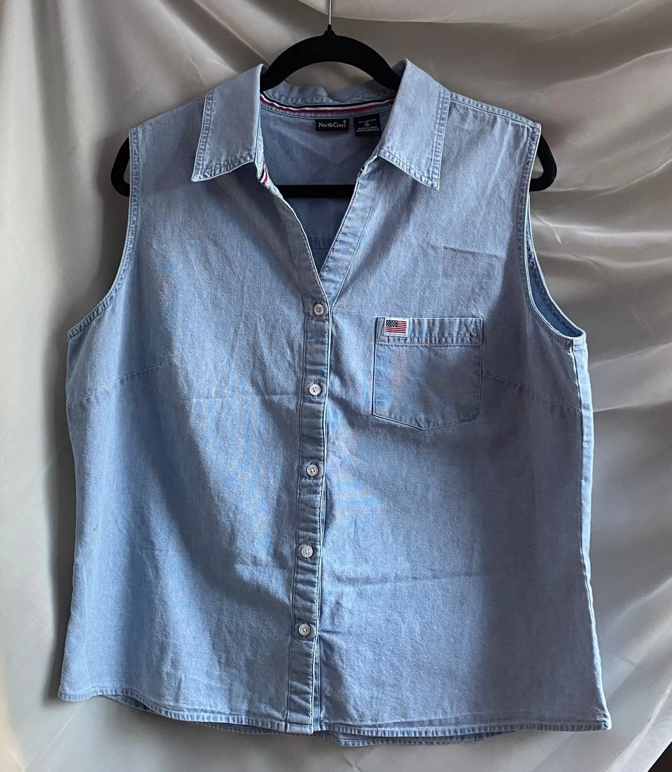 North Crest women's light blue denim sleeveless collared shirt top. Button-up front with a single c... Show more