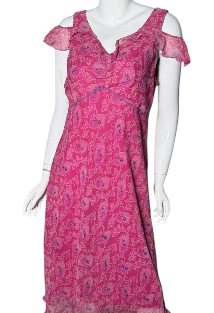Step out in style with this chic pink paisley midi dress. Perfect for any occasion, it offers a flattering fit and elegant design. Vintage ethereal midi dress. Armpit to armpit 22” flat. Length 46.5” approx. pullon dress.