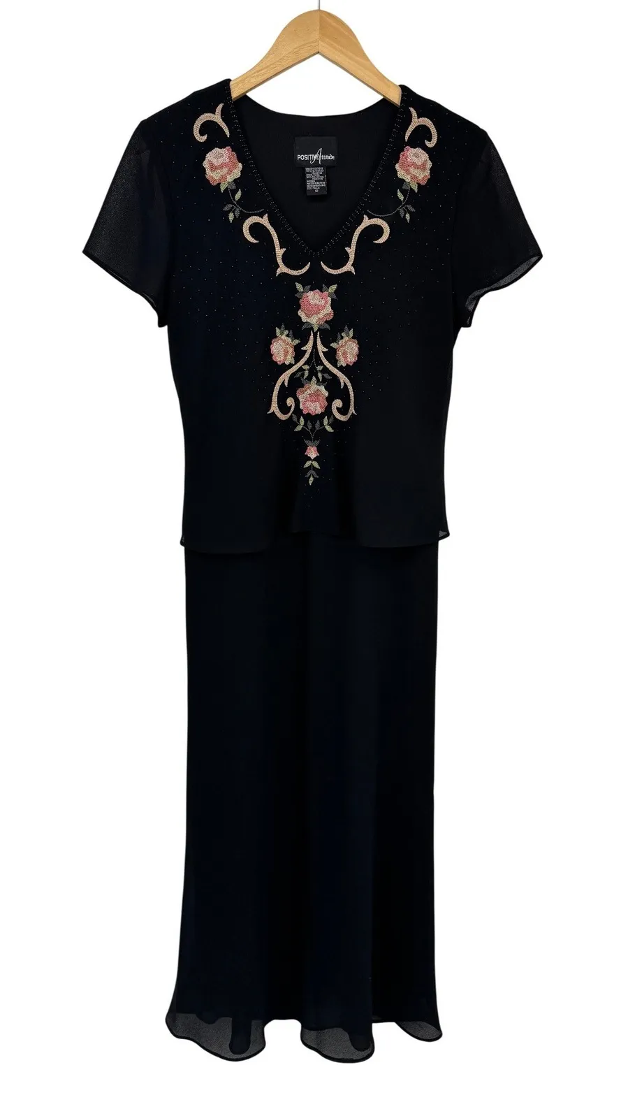 Elegance blooms in this captivating black dress from Positive Attitude. The sheer V-neckline is adorned with delicate embroidery featuring blush pink roses and trailing vines, meticulously accented with tiny black beads that catch the light with every movement. Short, airy sheer sleeves and a flattering peplum detail create a sophisticated silhouette that cascades into a flowing skirt. This dress is perfect for a special evening out, a sophisticated cocktail party, or a memorable wedding guest ensemble. Style: Shift, A-Line Dress Length: Midi Department: Women Sleeve Length: Short Sleeve Pattern: Floral Occasion: Party/Cocktail, Formal Material: Polyester Fabric Type: Chiffon Theme: Rose Neckline: V-Neck Season: Spring, Fall Sleeve Type: Cap, flutter Sleeve Closure: Pullover Accents: Beaded, Embroidered Features: Shoulder Pads, layered Excellent preowned condition - no rips, stains, or tears. From a smoke free, pet friendly home. Approximate measurements in photos. Seller Notes: -Same/Next Business Day Shipping -Smoke Free & Pet Friendly Home Keywords: Positive Attitude dress, black dress, embroidered dress, beaded dress, rose floral dress, cocktail dress, evening gown, special occasion dress, peplum dress, sheer sleeves, formal dress, mother of the bride dress, date night dress, feminine dress