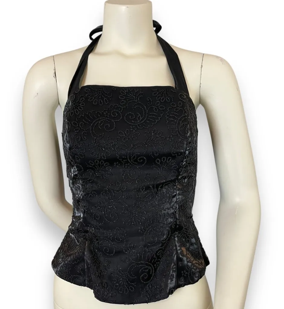 Vintage 90s Caty formal black halter top with a tie at the back neck and zipper closure. Glued on beads in swirling patterns on front. Square neckline. Condition: Preloved vintage with discoloration at the under arm area, missing half the zipper pull (still usable, but shorter than it would have been originally), snipped hanger straps, and some missing glued-on beads. No size or materials tag. Size: No size tag. Estimating to fit as size XS. See approximate measurements for best fit. Bust: 32" Across waist: 13.5" Length (not including ties): 14.5" This piece has not been cleaned, dry cleaning recommended. From a smoke-free home. Fast shipper!
