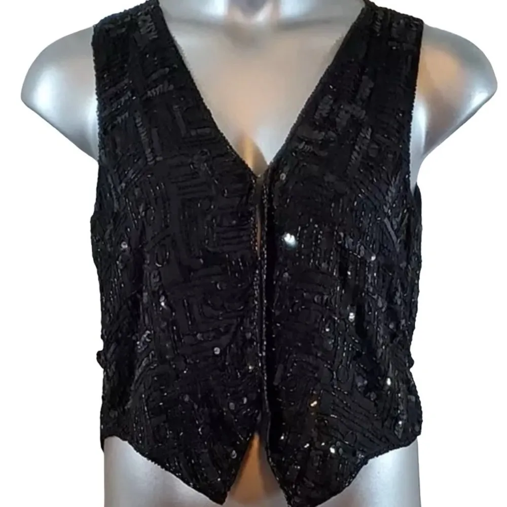 adjustable back strap , eye hook closures , black sequins and beads 19-20 inches pit to pit 22 inches long so many styling possibilities & aesthetics dark academia , classic , 90s pair witb a choker & jeans , perfect fir christmas dinner parties , pair with Black Satin trousers & heels & your Cocktail attire , wear for New year’s eve . , western glam w/ a denim skirt $ black cowgirl boots !