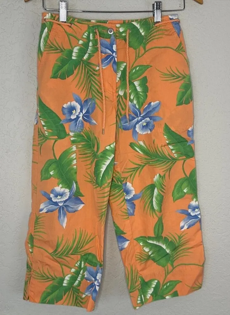 Vintage Ralph Lauren Floral Capri Pants Size 2P 100% Cotton Rope belt, silver logo button Orange... Show more