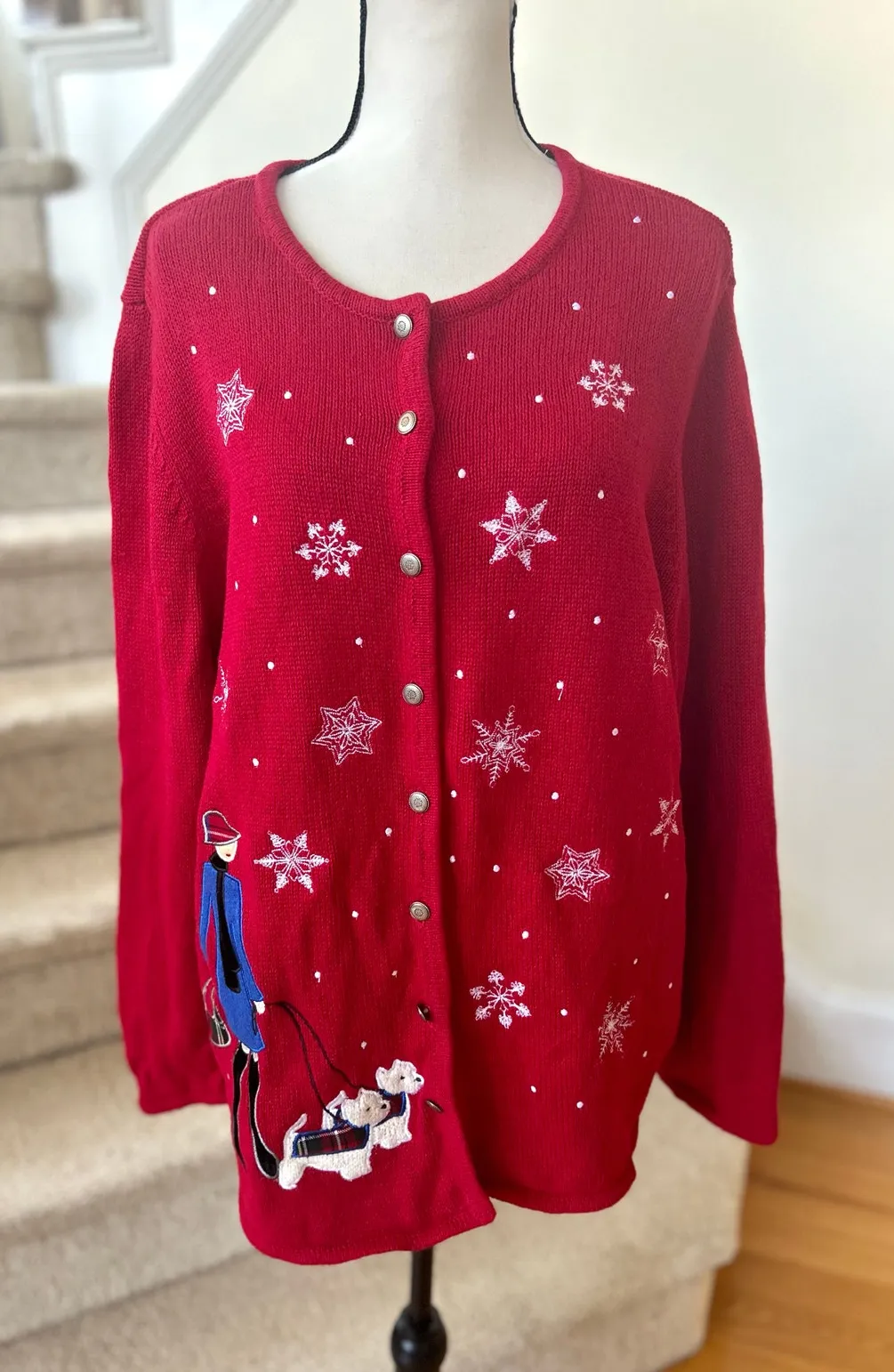 Very good condition, the very last button is missing--I've closed the hole so it is not noticeable, see photo. Red, crewneck, button front cardigan. All over embroidered snowflakes, with lady walking her scottie dogs on the side. Size 2X pit to pit 26 inches shoulder to hem 26 inches cotton/ramie