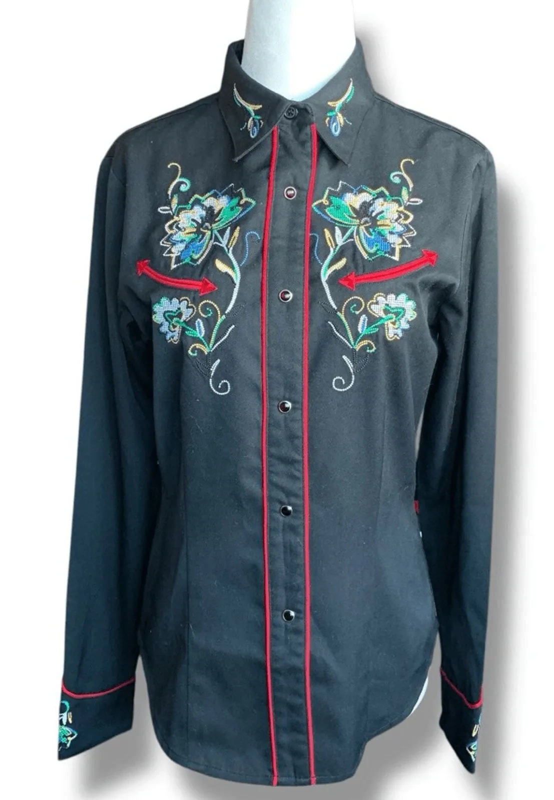 Vintage western embroidered button down shirt Roper brand authentic western wear 1990s era true vintage Black base with multicolor floral embroidery Arrow embroidery detail on chest Full embroidered back yoke Embroidered collar and cuffs Long sleeves with snap button cuffs Structured woven fabric Tagged size Small Flat Lay Measurements 18.5 inches pit to pit 26 inch length Classic western rodeo cowgirl style