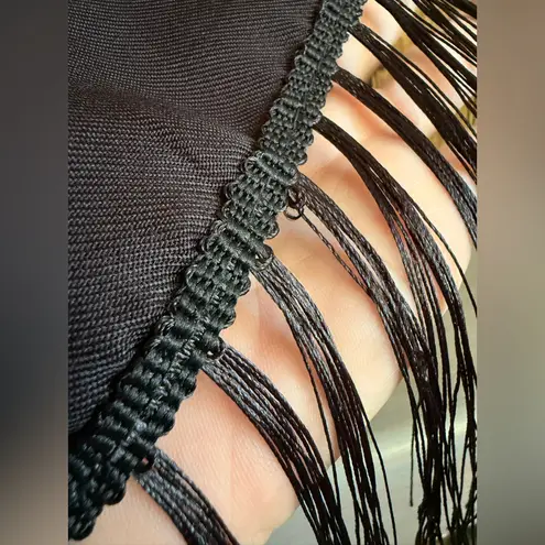 Vintage late-20th-century folk-style shawl featuring a bold red and pink rose floral print on a black ground. Traditional square silhouette measuring approximately 40” x 40” (not including fringe), finished with long black fringe along the edges. Russian / Eastern European babushka-inspired design. Made of 100% viscose with a soft drape and smooth twill weave. A striking accessory for boho, cottagecore, or folkloric styling.