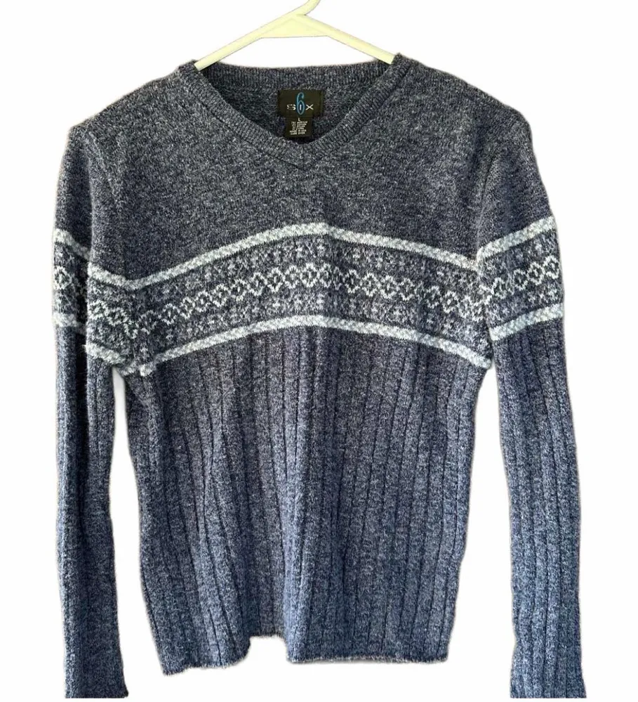 effortless 90s style with this vintage s6x Fair Isle knit sweater. The blue heathered ribbed knit body is accented with a classic white Fair Isle pattern across the chest, giving it that timeless ski lodge meets grunge vibe that’s so on-trend right now. Crew neckline, fitted silhouette, and long sleeves make this perfect for layering or wearing solo. Made in USA—a quality vintage find you won’t see everywhere. Size: Large (vintage sizing runs smaller; closer to modern Medium)Bust: 37 inchesWaist: 30 inchesLength: 21 inchesFabric: 79% Acrylic, 17% Cotton, 3% Nylon, 1% Lycra Condition: Pre-owned and gently worn. No rips, stains, pilling, or damage. Ready to wear. Keywords: vintage sweater, 90s knit, Fair Isle, grunge aesthetic, Y2K fashion, ribbed knit, crew neck, fall layering, winter staple, made in USA, s6x, retro pullover