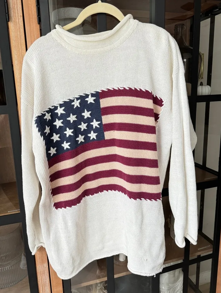 Size small Ramie & cotton blend BRAND IS COUNTY SEAT Classic Americana style with bold red, white & blue flag graphic • Thick cotton blend knit — 55% ramie, 45% cotton • Slightly oversized slouchy fit, labeled size Small • Crewneck with drop shoulders and ribbed cuffs & hem • Unisex patriotic pullover, perfect for 4th of July or year-round • Rare and nostalgic piece from iconic mall brand County Seat / similar in style to Ralph Lauren, Dairy Boy and Parke • Great vintage condition with minor wear consistent with age see all pics will ship as is.