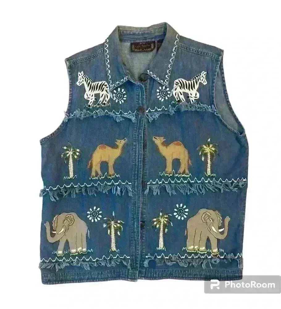 Vintage 90's Y2K Denim Vest Embroidered Safari Animals Size XL Made in India Blue - $25 - From Valerie