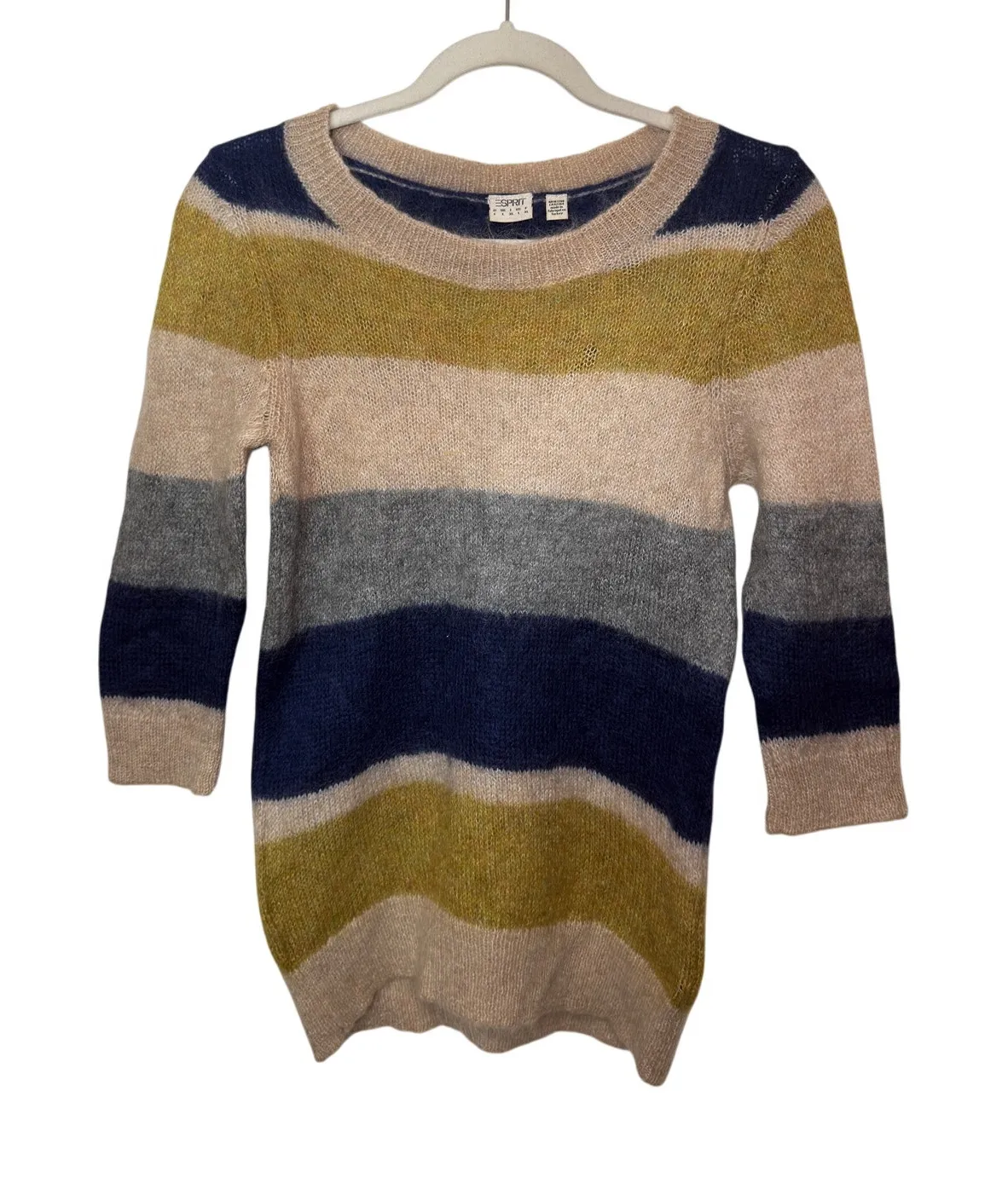 Premium Material: This beautiful sweater is made with a 50% Mohair and 20% Wool blend, giving it a wonderfully soft, fuzzy, and fluffy texture that is perfect for cold weather. Due to its vintage nature, there is some thinning of the fluffy fibers on the top left chest area of the sweater and throughout the garment. The integrity of the knit itself is excellent. Please see photos for reference. • Style: Vintage Esprit, featuring a classic boat neck and flattering 3/4 sleeves. • Aesthetic: Iconic 90s/Y2K striped pattern in desirable colors: Navy, Gray, Taupe/Oatmeal, and Mustard Yellow/Chartreuse. • Size: Tagged Size L/XL