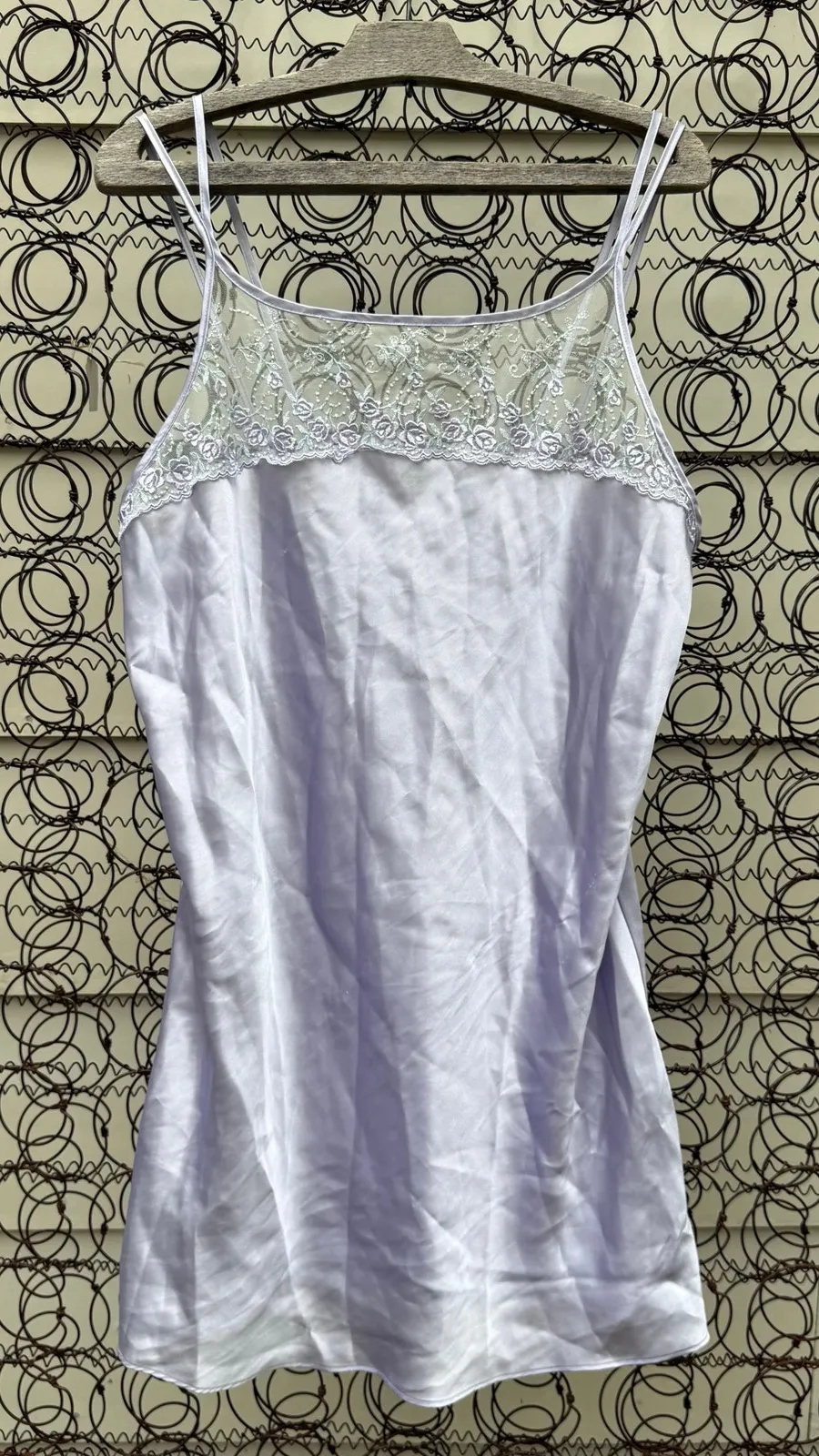 Vintage 90s Y2K Katherine Bishop Lilac Purple Slinky Slip Dress Floral Illusion see thru lace neckline with floral design slinky body of slip 100% Polyester double strap tag size LARGE good preowned condition, some snags measurements in photos