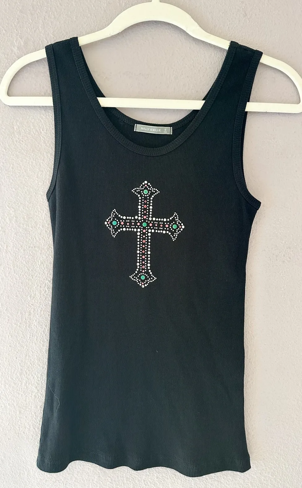 -Preowned condition -Size: Small -The approximate pit to pit flat lay measurement is 12.5" and the length is 23.5" Keywords: Nally & Millie, black tank top, rhinestone cross, ribbed tank, womens tank top, small tank top, sleeveless top, casual top, cotton tank top, studded tank, cross design, black top, grunge top