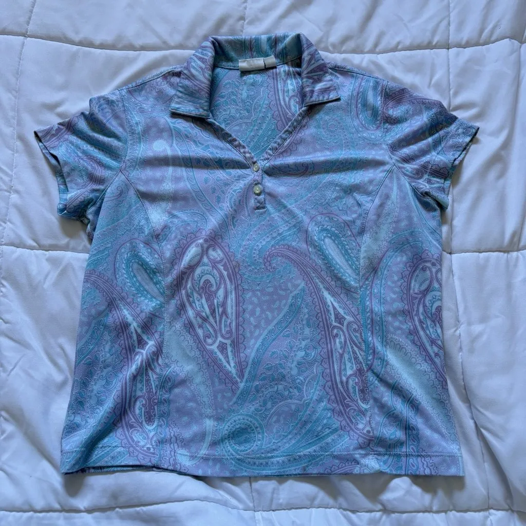 The product is a vintage 90s Y2K Tail golf polo short sleeve top in lilac paisley, designed for wome... Show more