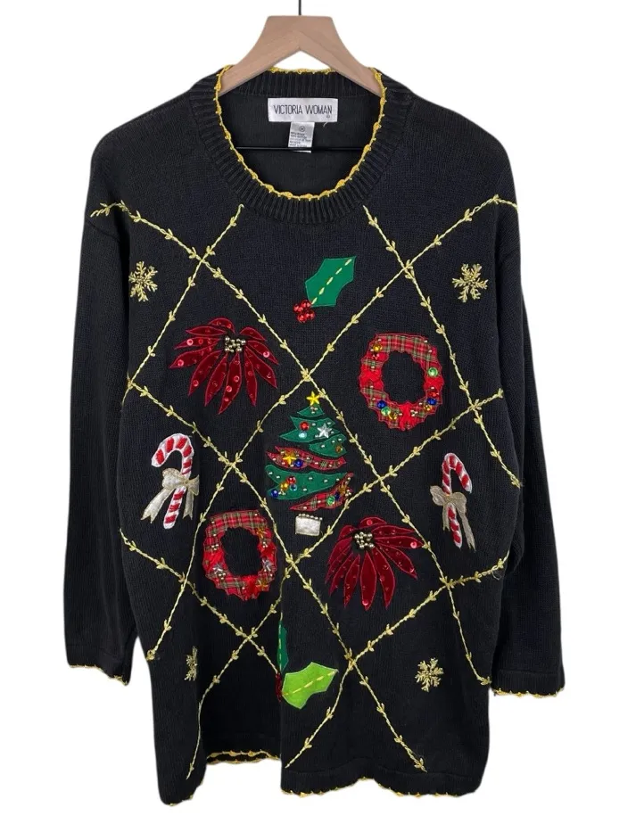 Vintage 90s 2000s Y2K Victoria Woman Christmas Holiday Sweater Ramie/Cotton Black knit with colorful embroidered design and jewel embellishments Featuring Christmas trees, candy canes, poinsettia, holiday wreaths, and holly Long sleeves Rounded neck Size 1X Great pre-owned/vintage condition Approximate measurements: Pit to pit: 26” Length from shoulder: 31” tags: holiday, christmas, christmas party, ugly christmas sweater, new years, plus size, winter, colorful, merry christmas