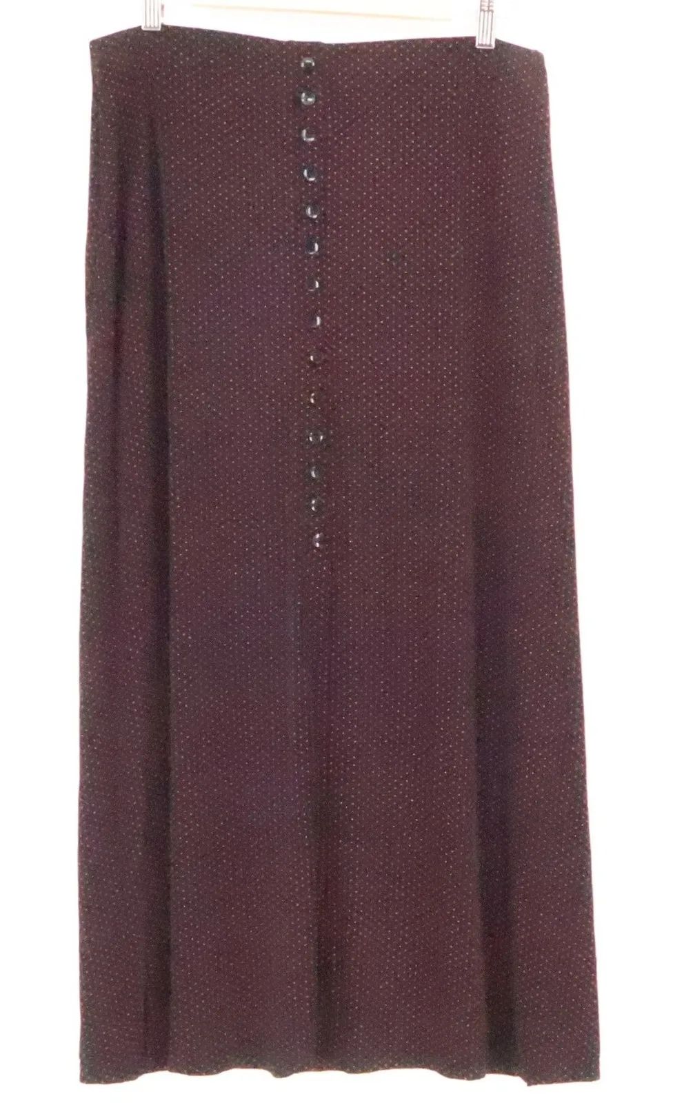 Vintage Briggs New York skirt featuring a black base with red polka dots and button detail on the front. Flowy silhouette with a midi length for an elegant vintage look. Style Aesthetics: Vintage - Retro - Classic - Polka Dot - Made in USA - Timeless - Comfort - Business Casual - Career Features: Black with Red Polka Dots – 90% Nylon 10% Spandex – Made in USA – Midi to Maxi Length – Flowing Silhouette – Stretch Fabric - Front Slit Condition: Excellent pre-owned condition. Measurements in photos – please review measurements prior to purchase to ensure fit. Measurements: • Waist: 16.5 in • Length: 36.5 in Please note: Color may vary slightly due to lighting and screen differences. Offers welcome!