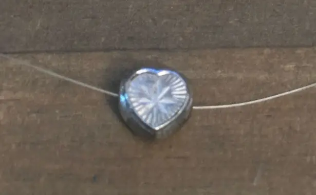 In excellent condition. Thin clear monofilament chain with a small 925 silver, diamond cut sliding heart pendant. Spring ring clasp. Pendant is stamped 925 Thailand and clasp is stamped 925. 15”