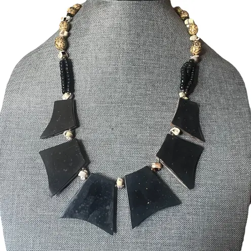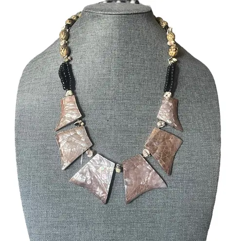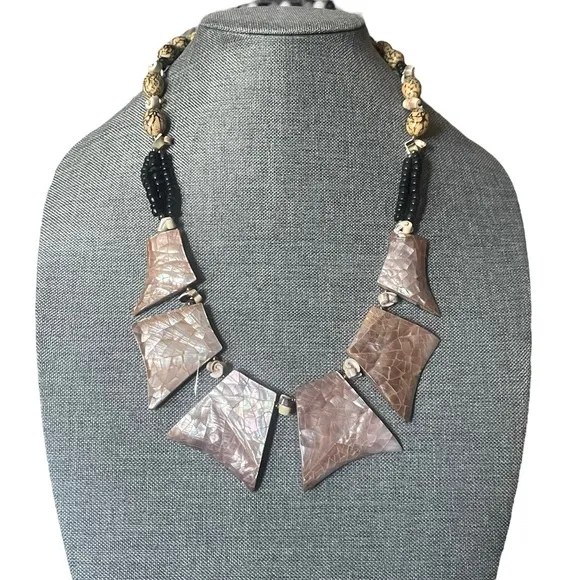 So different and unique. Large geometric shapes covered in rose colored abalone shells. Shell spacers. Upper necklace is marbleized tan beads. On each side there’s strands of black shell beads. One side has 3 strands and the other side there’s two. Sheppard hook clasp. 22”. Hangs at 24”
