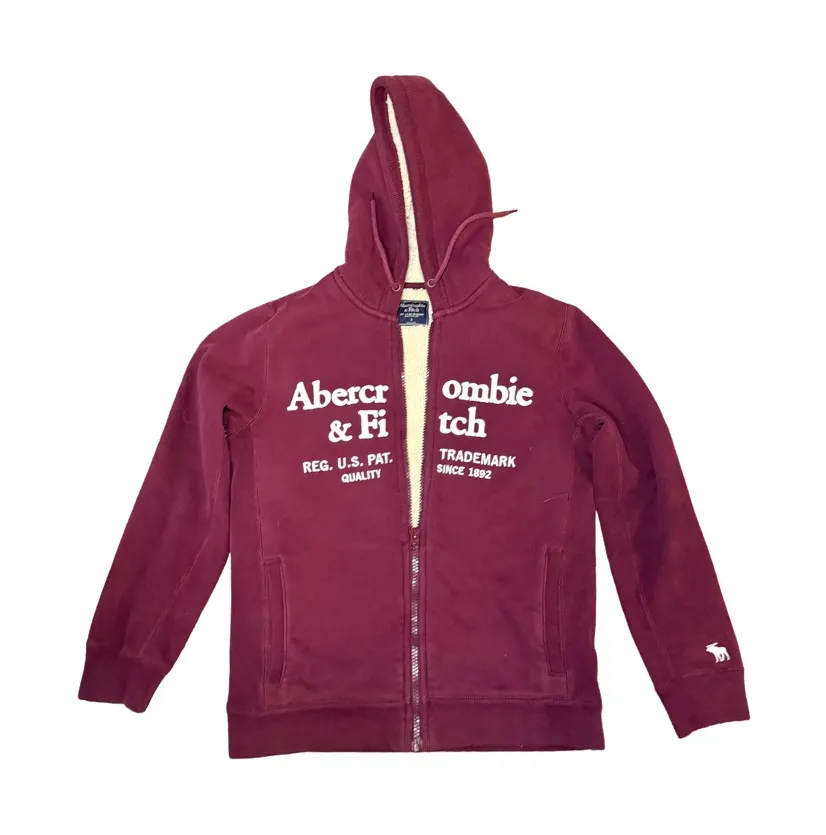Burgundy hoodie with front zipper. Features logo print and side pockets. Includes a hood and fleece... Show more