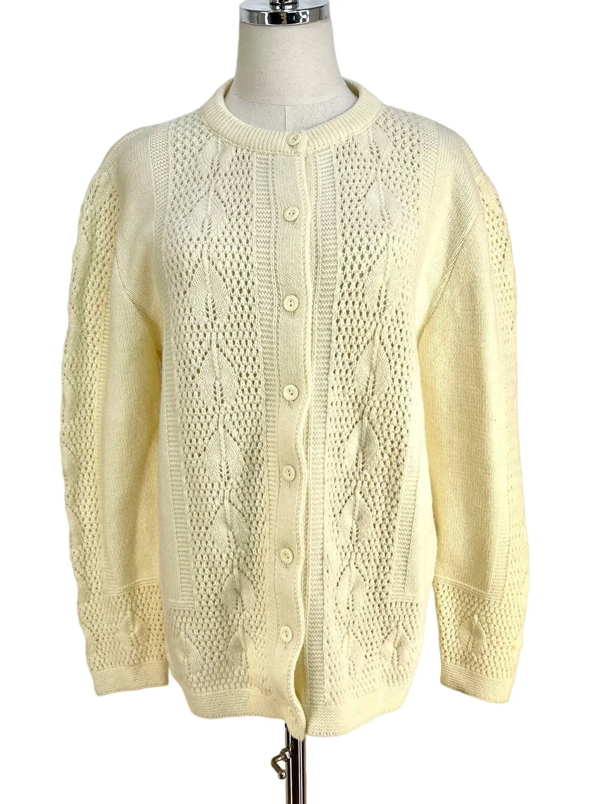 Vintage Acrylic Knit Cardigan Ivory Ecru by Jolie Fishermancore Preppy No Size indicated, estimated size L/XL Preowned item in excellent overall condition. No odors, stains, or holes. Color is an off white/cream. Long sleeves with pointelle leaf motif. Chest 22.5" Length 26.5" All measurements taken flat. May arrive wrinkled or folded.
