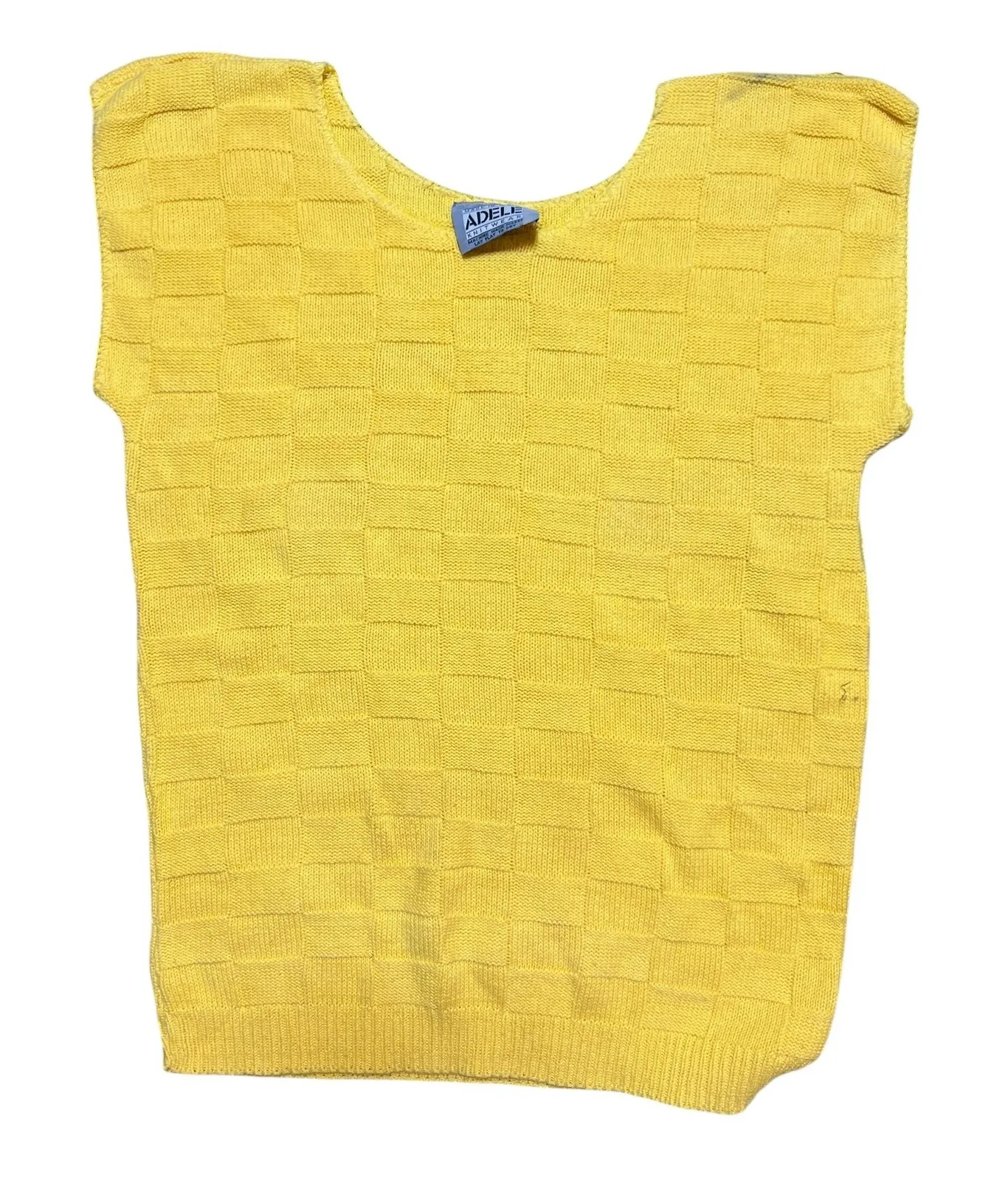 EUC - 90's wear! Super cute and trendy. See measurements, no size tag. Sunshine brightens your wardrobe with this ADELE KNITWEAR sleeveless sweater. The unique checkerboard knit texture adds a playful dimension to the vibrant yellow hue, creating a piece that's both eye-catching and comfortably chic. Its sleeveless design makes it perfect for layering on cooler days or wearing solo when the weather warms up. Imagine this cheerful top paired with jeans for a casual brunch or styled with a skirt for a relaxed afternoon outing. Style: Vest Department: Women Material: Cotton Neckline: Scoop Neck Sleeve Length: Sleeveless Type: Sweater Features: Stretch Pattern: Geometric Sleeve Type: Cap Sleeve Fabric Type: Knit Knit Style: Waffle-Knit Season: Spring, Summer Fit: Classic Occasion: Casual Garment Care: Machine Washable Keywords: ADELE, knitwear, yellow, sleeveless, sweater, checkerboard, textured, casual, lightweight, vintage, retro, summer, spring, layering