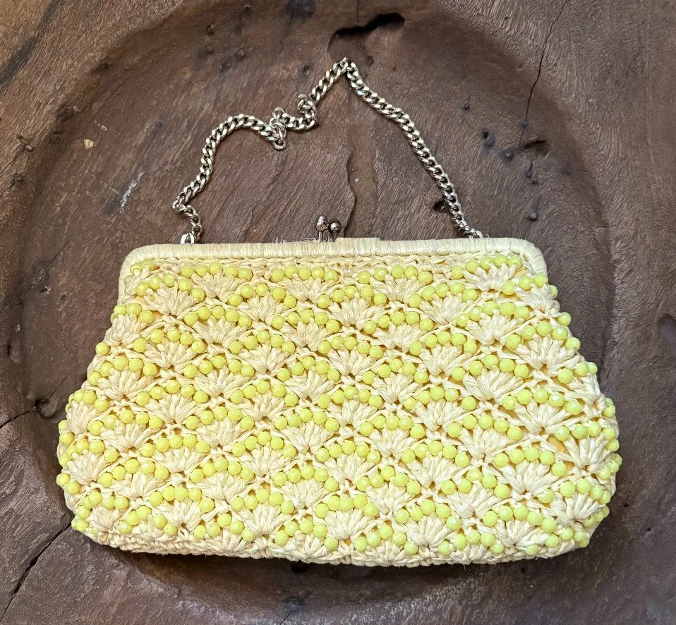 Charming little vintage chartreuse/neon yellow/lemon yellow/butter yellow raffia beaded ADG bag made in Japan. With chain. Interior zipper pocket. Very clean and gently used for its age. Fun pop of color for a party or wedding. You can slip the chain inside to use the bag as a clutch. Measures roughly 10 x 6 x 2 inches, with a 6.5-inch strap drop.