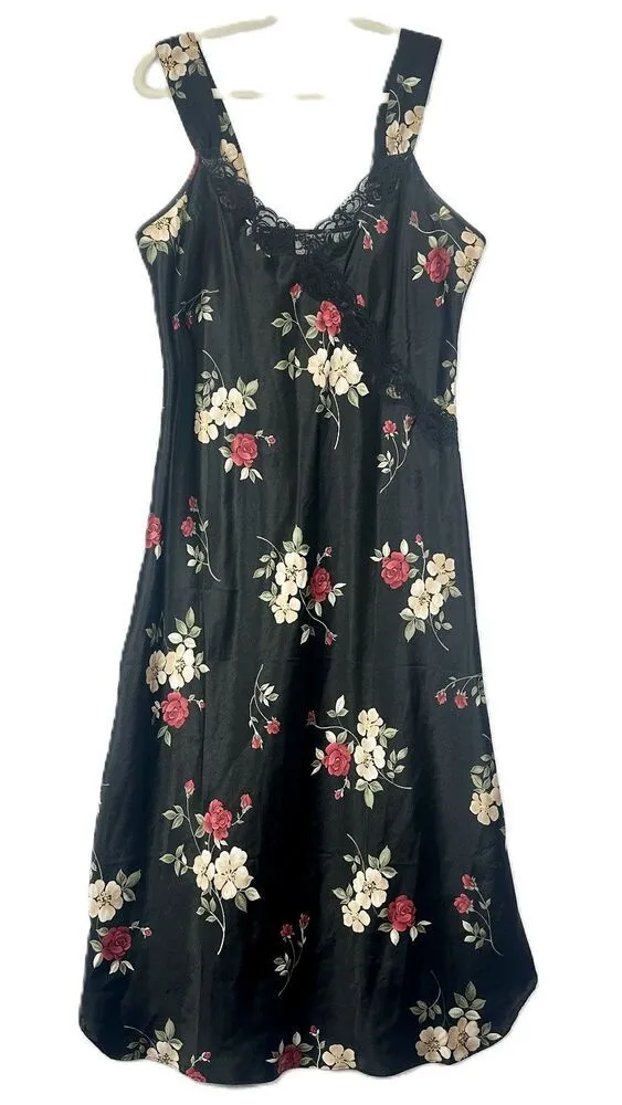 Vintage Adonna Floral Satin Midi Slip Dress Size Medium Lace Whimsigoth Black - $36 - From Samantha