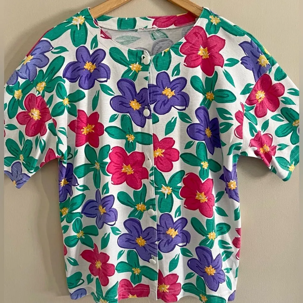 Bright and cheerful vintage Aileen short sleeve shirt featuring a bold allover floral print in purple, red, and pink with green leaves on white cotton. Made in the USA and tagged a size Medium. This 100% cotton shirt has a classic button-down front with white plastic buttons and a relaxed fit. Perfect for layering or worn tucked or loose. No shoulder pads. In great vintage condition with no major flaws. • Brand: Aileen • Tagged size M (vintage fit – see measurements if needed) • 100% cotton, made in USA • Classic button front (not snaps) • Bold floral print (red, purple, pink, green) • Short sleeves, straight hem • No shoulder pads A fun piece for lovers of retro, cottagecore, or garden party aesthetics. Length 24” Pit-Pit laying flat 21” vintage floral shirt, 90s cotton blouse, 80s gardencore top, cottagecore vintage, retro floral blouse, made in USA top, button down shirt, flower print tee, bold print vintage, spring aesthetic, summer retro shirt, soft vintage cotton, grannycore blouse, maximalist fashion, plant mom outfit, dopamine dressing, casual vintage top, colorful floral shirt, momcore vintage, y2k cottage vibes